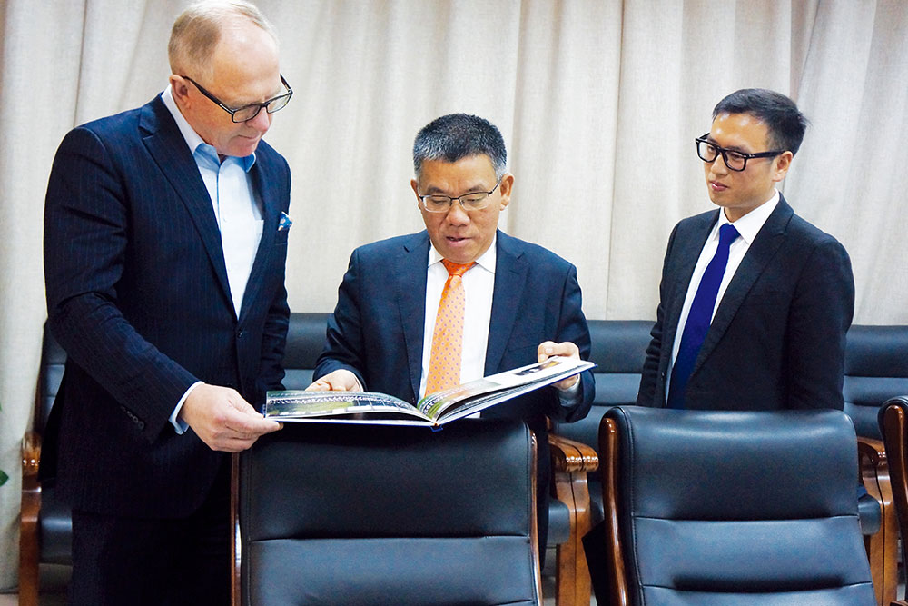 曾光安(中)向Pekka Vauramo(左)展示柳工纪念画册