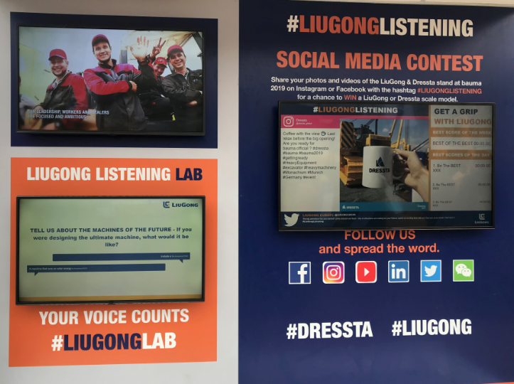 本届展会上,观众在柳工展位的核心位置会看到一块面积达24平方米的互动电子墙。无论是客户还是观众可以将他们对柳工/锐斯塔产品或者服务的任何想法、建议或者意见发布在电子墙上。在每台展示的新产品周边,设置有供观众近距离参观的走道。每台设备的设计师和工程师将在现场向观众进行讲解并聆听意见。同时,这些互动也将在展位的大屏幕和社交平台上同步播放。柳工展台设有专门的“交流中心”,收集大家对柳工下一代装载机产品设计和制造的想法、期望。