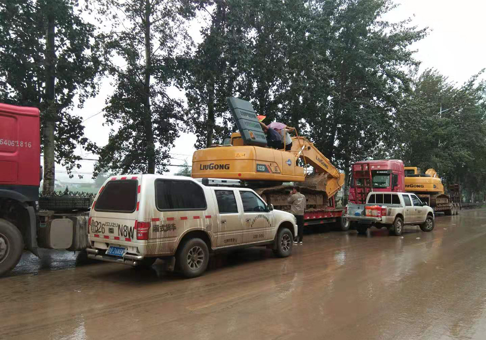 挖掘机在救灾现场进行挖深河道清淤工作,柳工两名服务人员在现场把控,确保设备的正常运行。从昨天晚上12点挖机车队抵达到现场后,车队成员就一直坚持在现场不停作业,随时听从调度。此刻车队在完成某地区的清淤工作后,正准备转战新的地方。