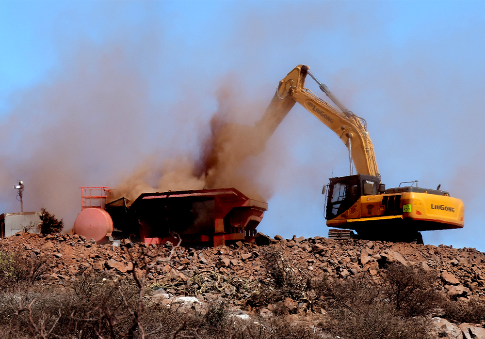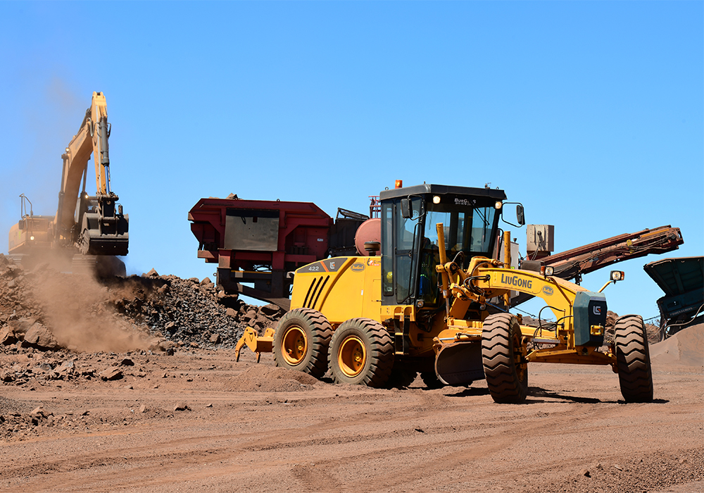 刚入锰矿基地,一大片褐红色的锰矿呈现在我们的眼前。工地安全检查程序严谨,我们在穿戴了劳保防护用品,进行了酒精测试后,开车到了柳工设备作业的现场。该客户于去年采购了包括柳工装载机、挖掘机、平地机和压路机在内的7台柳工设备,这些设备分别遍布于工地的4个开采施工区域。我们首先到达的是柳工970E挖掘机的工作现场,在那里,我们看到970E挖掘机庞大而矫健的身姿,正在忙碌地挖掘锰矿石,接着倒入筛分设备里进行筛分。一挖一倒,动作流畅连贯。