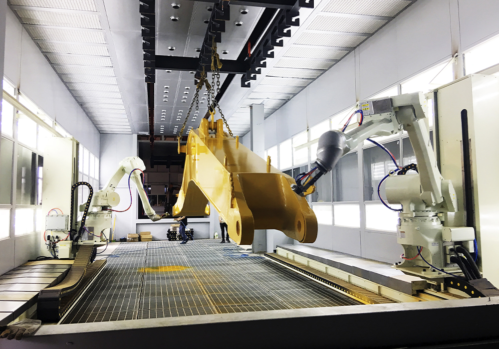 此外,挖掘机动臂斗杆喷涂自动生产线、装载机铲斗焊接自动生产线上,各种机器人系统正在各条生产线上有序运转。在相同产能下,每班人员仅需2人,人员减少12人,场地减少一半,物料流转次数减少3倍。
