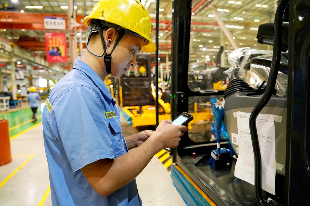 “自从用了MES之后,我们的工作效率和准确性得到大幅提升。原先每道工序都需要手写各种报表、签字确认,流程繁杂,容易出错,现在‘扫一扫’就能轻松搞定了!”9月23日,笔者走进柳工挖掘机公司总装厂装配车间,看到装配钳工谢森光正通过手持终端PDA扫描工位上的二维码,一扫就能轻松在线查询作业指导书进行装配,同时,他所做的每道工序都能被记录在内。