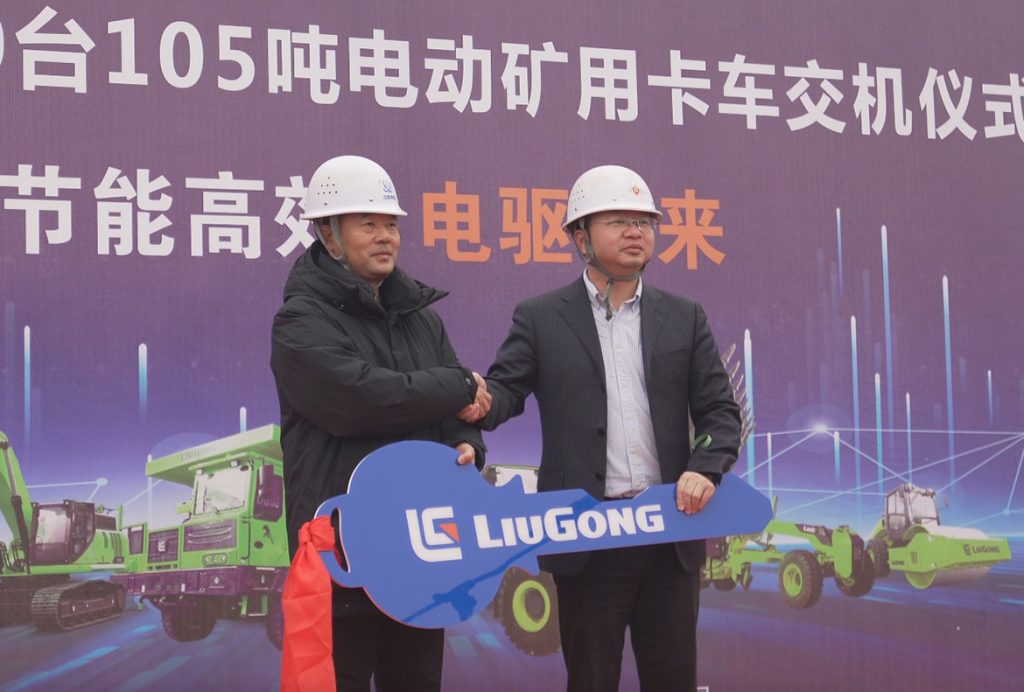 交付仪式上,广西柳工机械股份有限公司副总裁潘恒亮将金钥匙郑重交付客户,这批柳工电动矿用宽体车将服务于客户矿山项目物料运输。