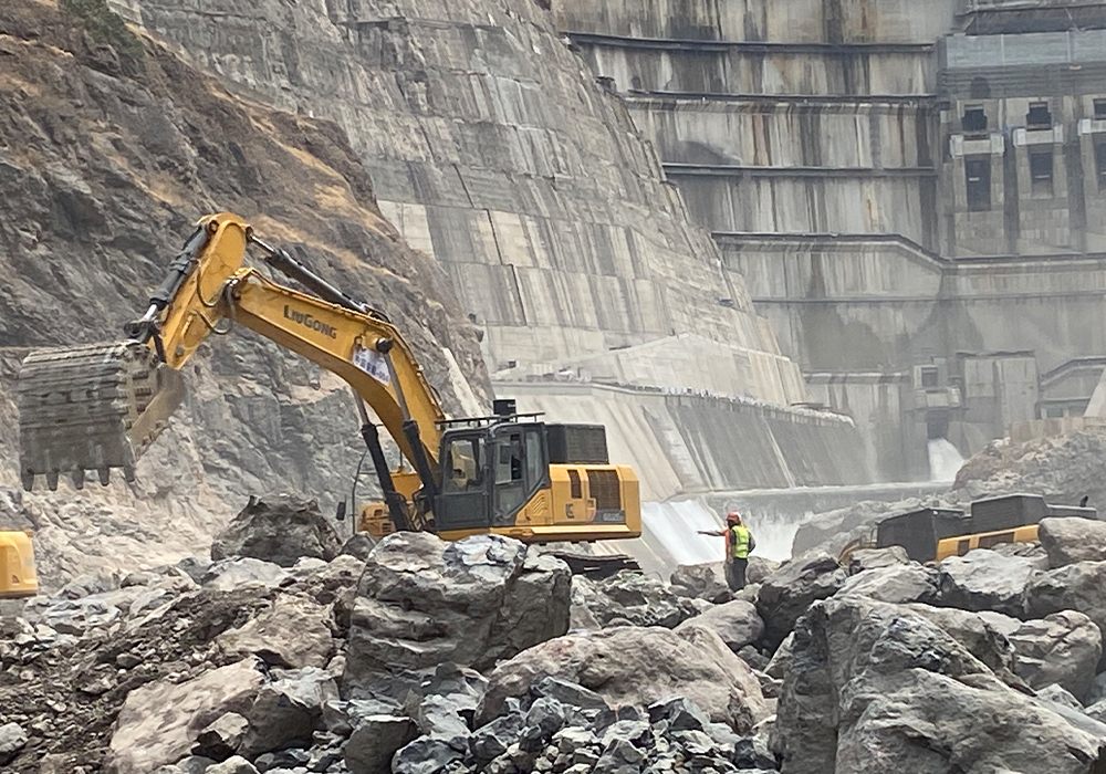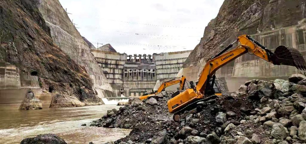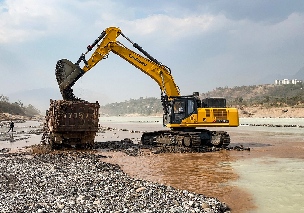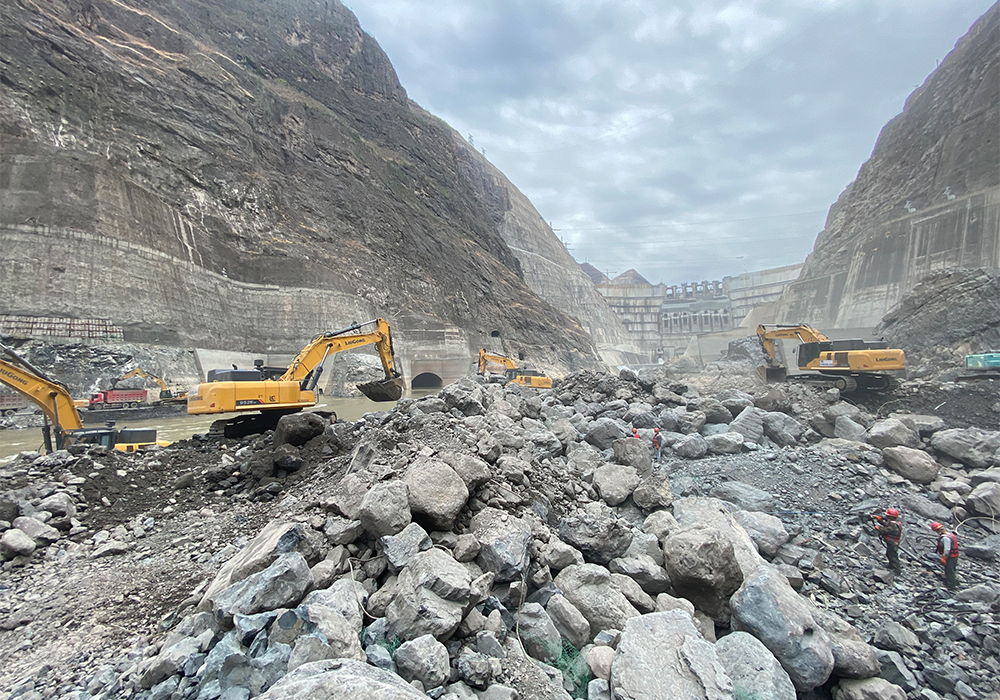 柳工大型挖掘机因为优异的表现并没有因为阶段性任务的完成而离场,而是被施工方留下来,安排到大坝的下游地区,参与河床石头清理工作。